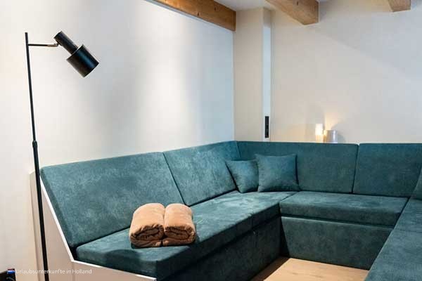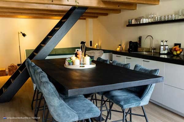 Die Küche im Untergeschoss ist modern eingerichtet und mit allen Annehmlichkeiten wie Geschirrspüler, Nespresso, Kühlschrank, Gasherd, Toaster und Tiefkühlfach ausgestattet. Neben der Küche steht ein toller Kingsize-Tisch mit 8 bequemen Stühlen; ideal für einen Umtrunk oder einen Spieleabend. Das sehr große Sofa (das bei Bedarf zu einem extra Super-Kingsize umgebaut werden kann) bietet viel Platz zum Lesen, TV-schauen oder einfach, um sich zu unterhalten.
