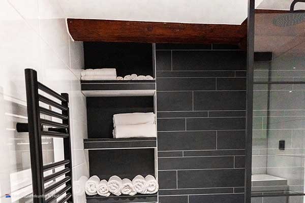 Im Obergeschoss (das über die Treppe erreichbar ist) stehen 2 Kingsize-Betten, es gibt ein modernes Badezimmer mit Regendusche und doppeltem Waschbecken, ein separates WC und eine Kammer mit Waschmaschine und Trockner. Die Schlafbereiche sind nur durch einem Vorhang voneinander getrennt, wodurch es natürlich etwas hellhörig ist, dafür aber auch sehr gemütlich.